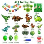 Dinosaur party set include: 5 Pcs large sized dinosaur balloons,1 Pcs”HAPPY BIRTHDAY” banner, 1 set party folding fan, 5 Pcs simulated leaves, 60 Pcs Latex balloons(Color:Green and Dark Green and Agate balloon ), 5 Pcs small dinosaur balloons,1 Pcs large sized coconut tree, 3 Pcs party rain curtains and related tools