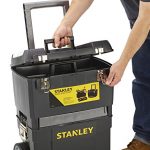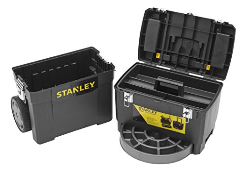 Stanley have produced a 2 in 1 mobile work station that separates in seconds into 2 units. The Stanley 193968 has an extra large tool box with removable tray that maximises volume utility and a giant bin capacity. This Stanley mobile tool chest has many features in store and gives the user a top quality all round winner in tool storage with its swivel front drawer (carousel) and lid organizers for small parts, large trucking wheels for rough on site conditions, new one piece strong plastic handle, all weather nickel plated toolbox and side latches and with a load capacity of 88lbs you get a good array of tools at your side.